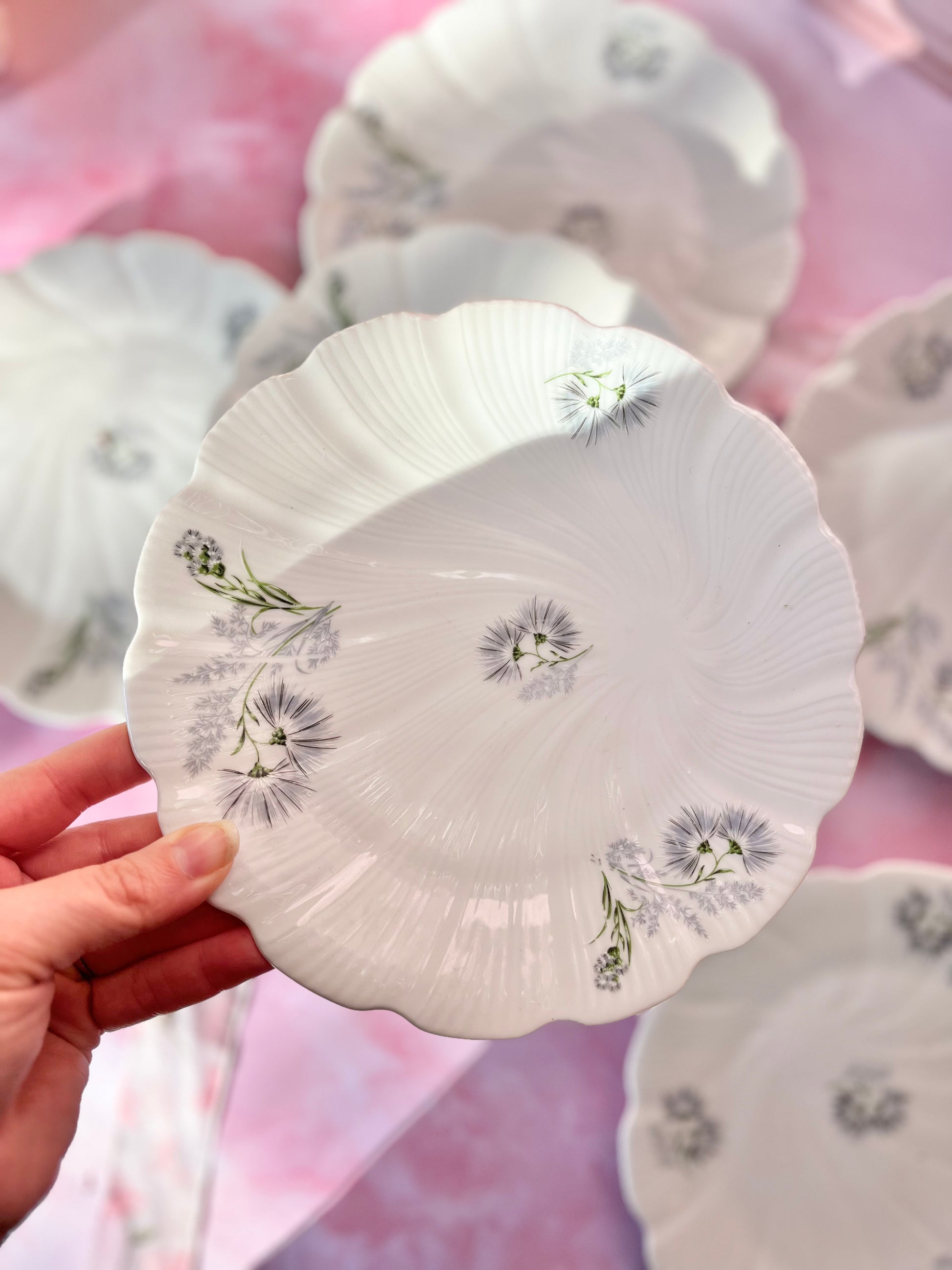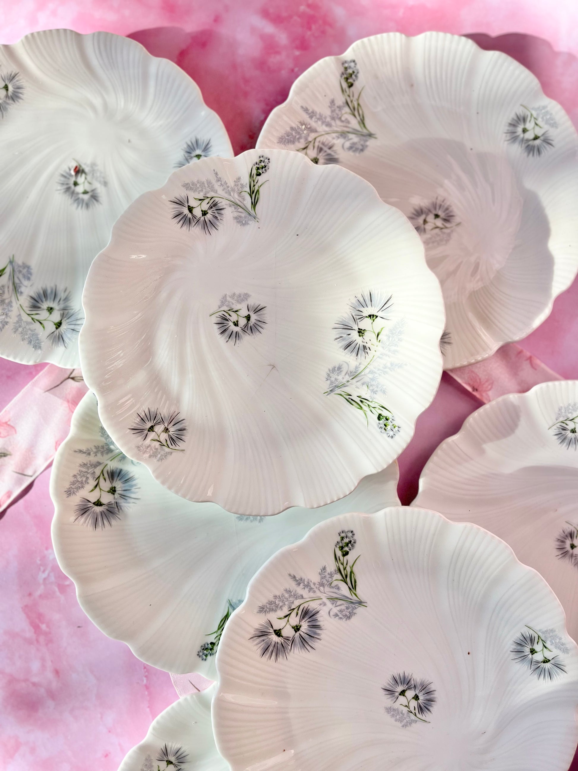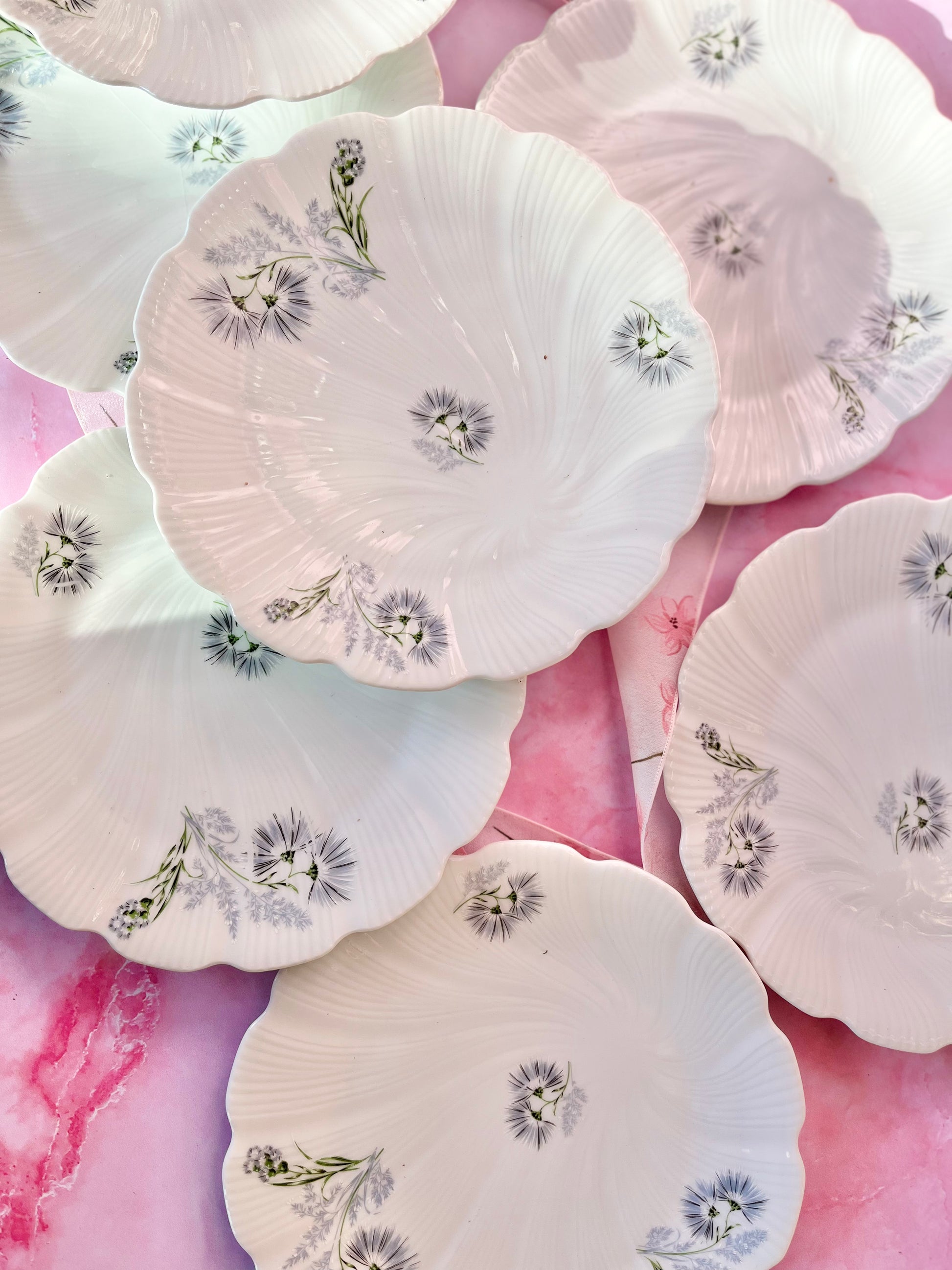 Magnifique lot de 9 assiettes à dessert en porcelaine de Limoges, au délicat décor de fleurs bleues. Leur effet torsadéapporte une touche raffinée, idéale pour sublimer vos tables du quotidien comme celles des fêtes.