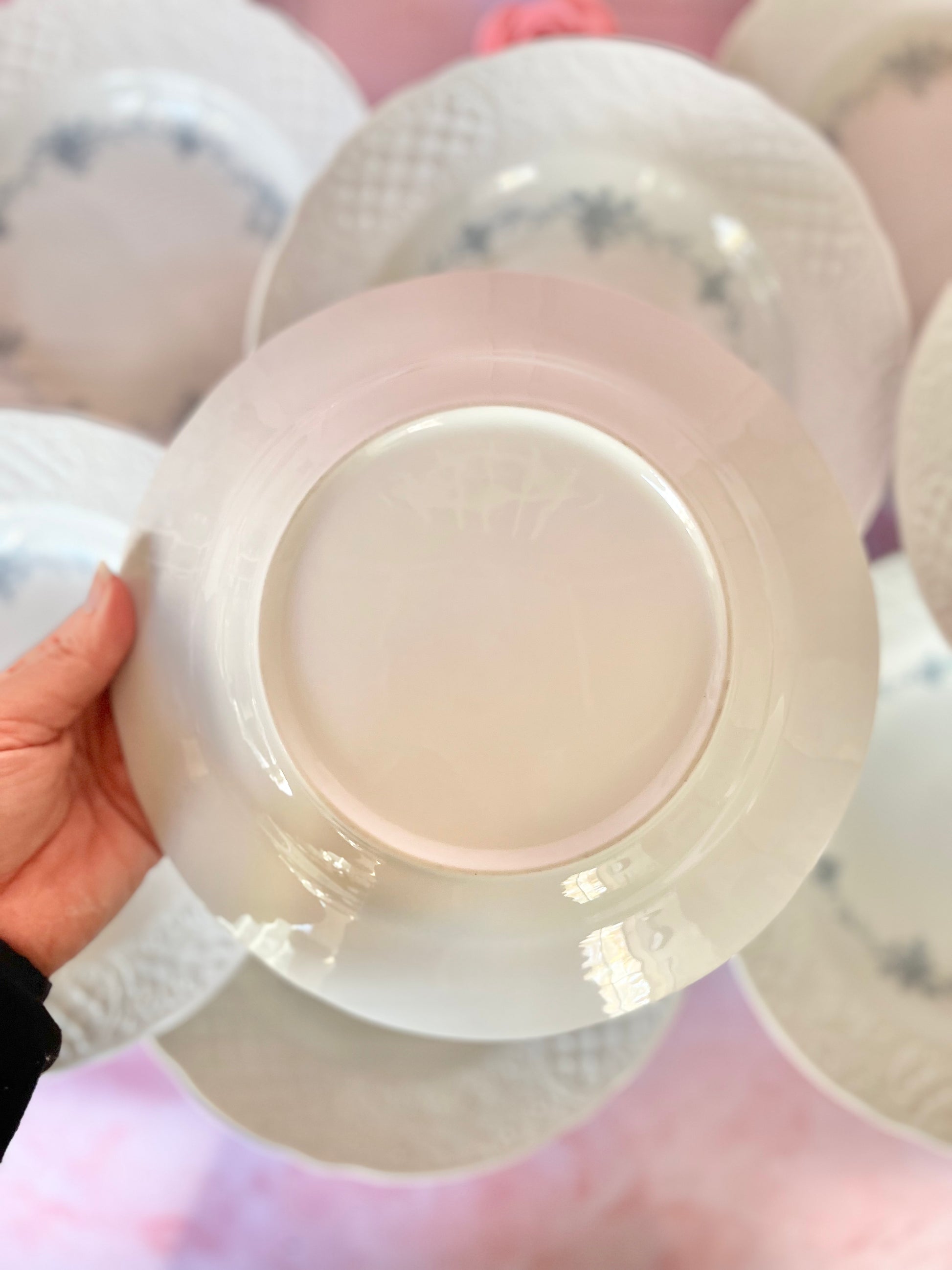 Superbe lot de 9 assiettes creuses anciennes, en porcelaine fine, dotées d’un contour en léger relief très élégant. À l’intérieur, une couronne florale bleutée peinte à la main, délicate et raffinée — un charme fou qui sublime n’importe quelle table.