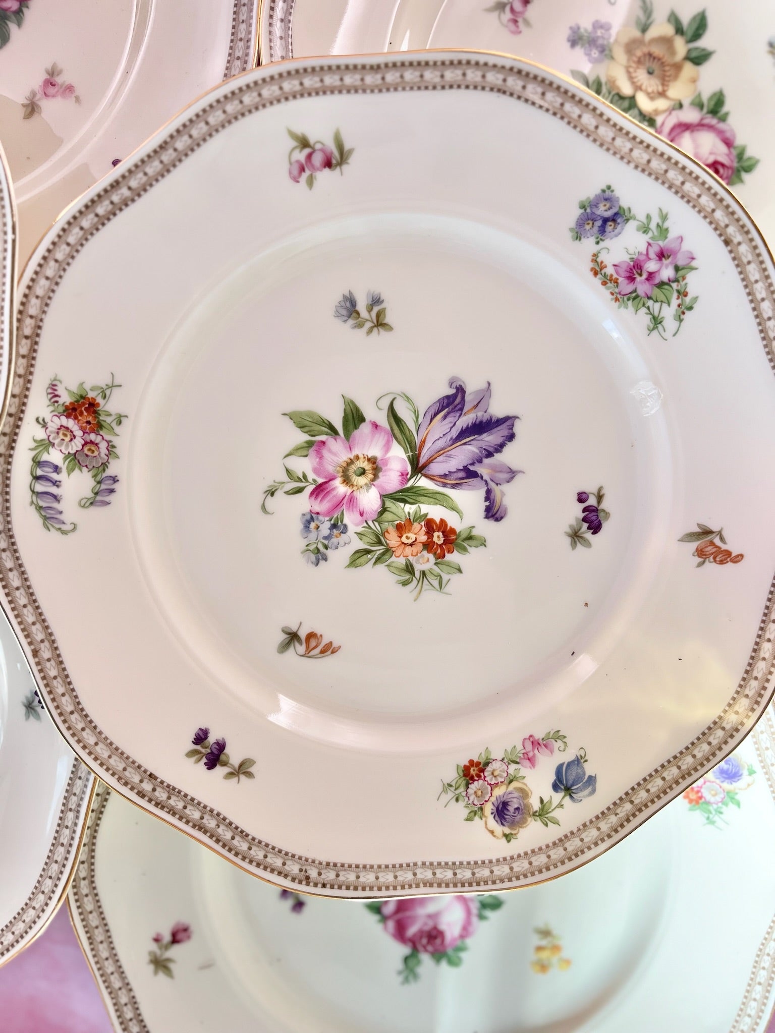Superbe lot de 9 assiettes plates modèle Carlsbad en porcelaine, au charme raffiné et délicatement vintage.