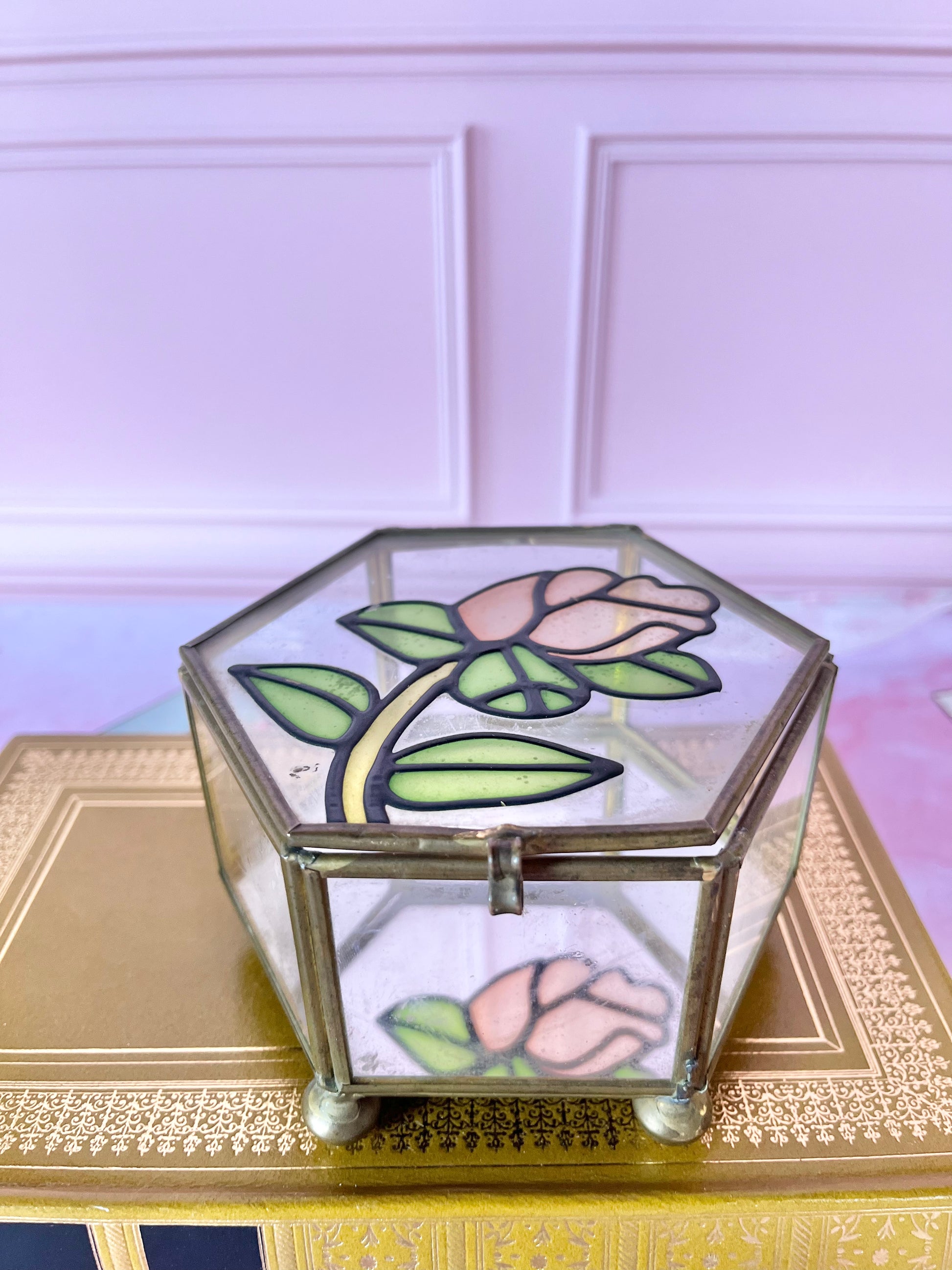 Superbe petite boîte à bijoux vintage, ancienne et pleine de charme, avec un délicat décor floral. Sa structure en verre et laiton lui donne ce style rétro irrésistible, tandis que l’intérieur miroir ajoute une touche raffinée et précieuse.