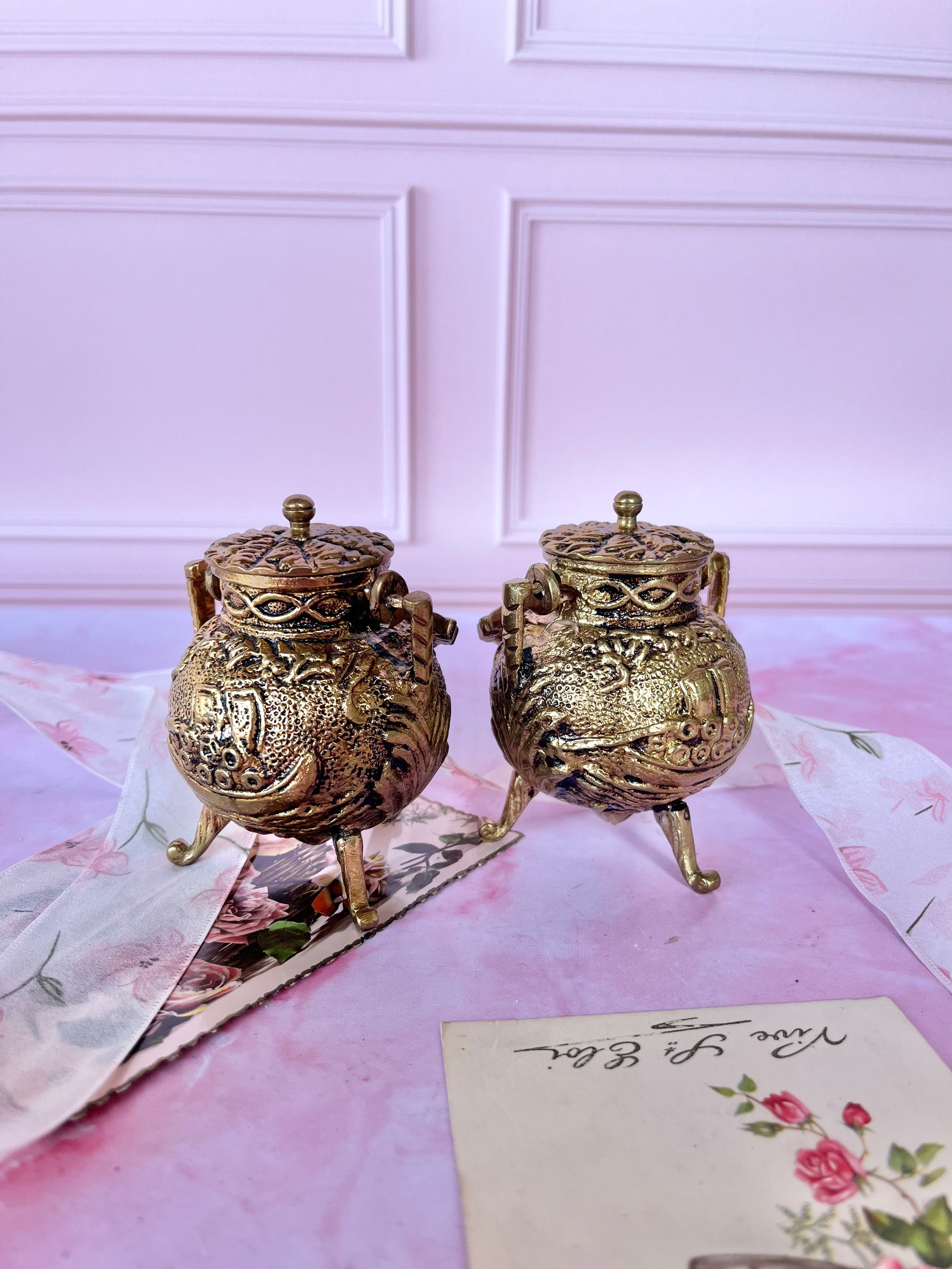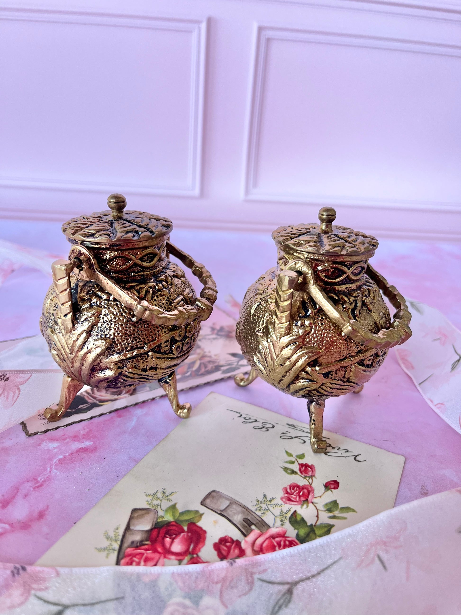 Craquez pour ce superbe duo de petites boîtes en bronze doré, adorables formes marmites, au style vintage plein de caractère. Deux pièces décoratives aussi jolies qu’originales, parfaites pour apporter une touche d’authenticité à votre intérieur.