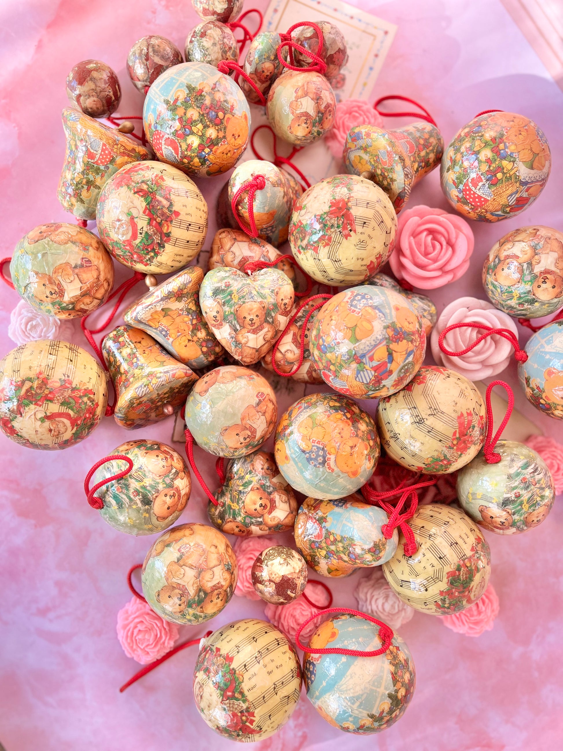 Magnifique lot composé de 39 boules de Noël vintage dépareillées, en papier mâché, pleines de charme et de caractère.