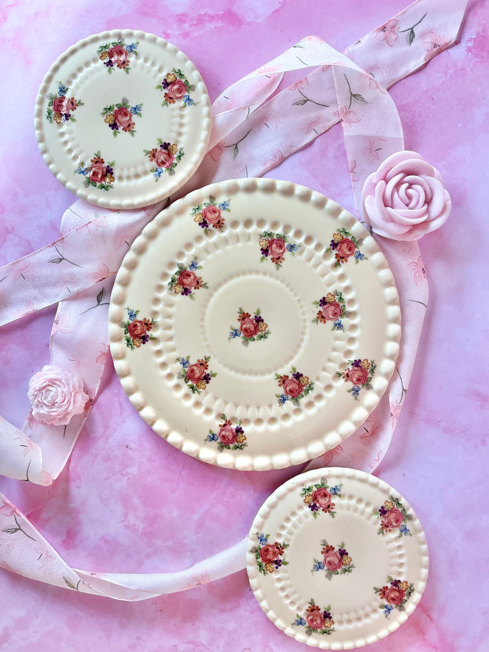 Un ensemble plein de douceur et d’élégance, qui apportera un superbe effet romantique et vintage à votre table. À la fois décoratif et fonctionnel, il peut également être utilisé comme trois dessous de présentation pour sublimer vos mises en scène de table.