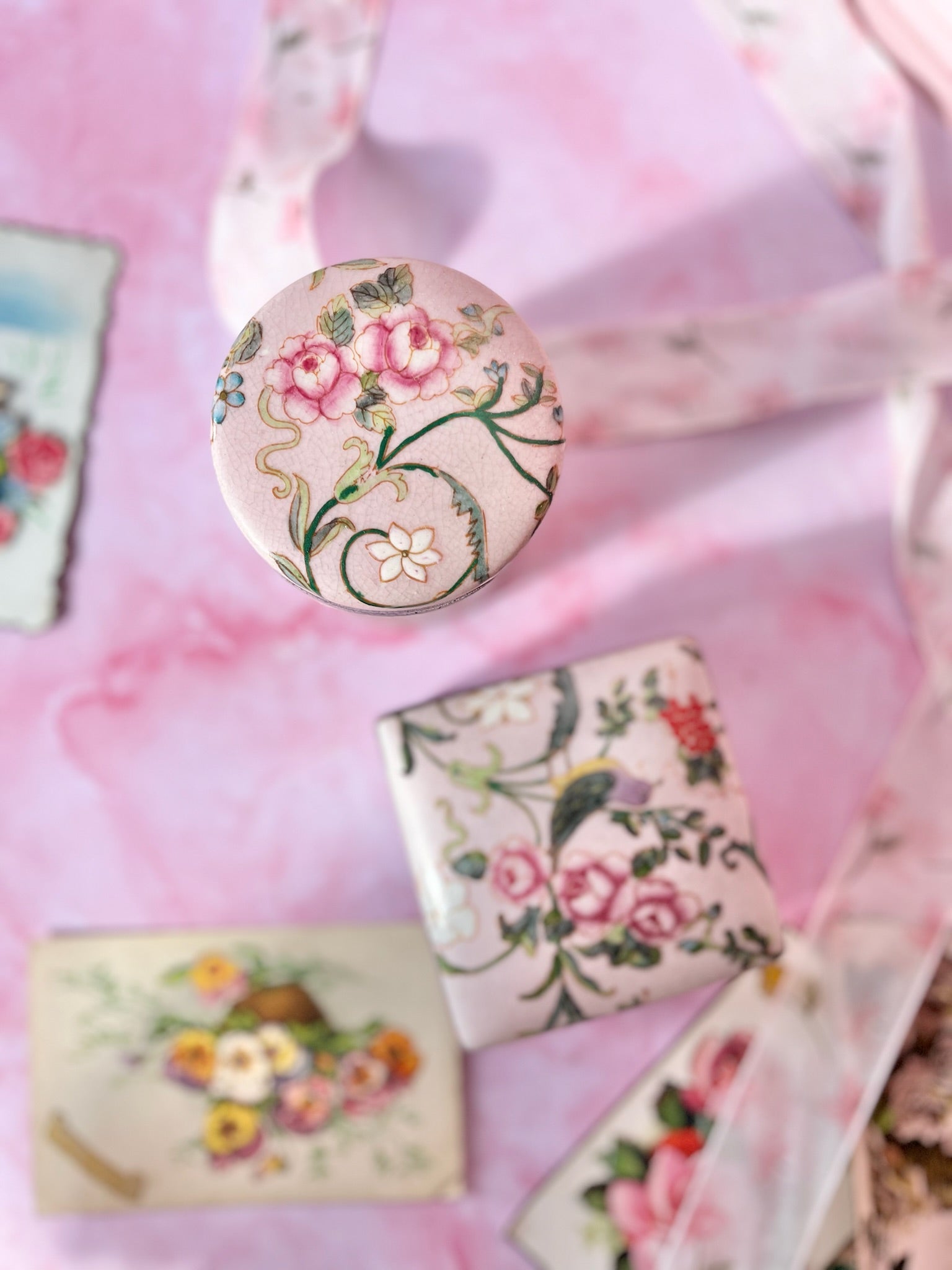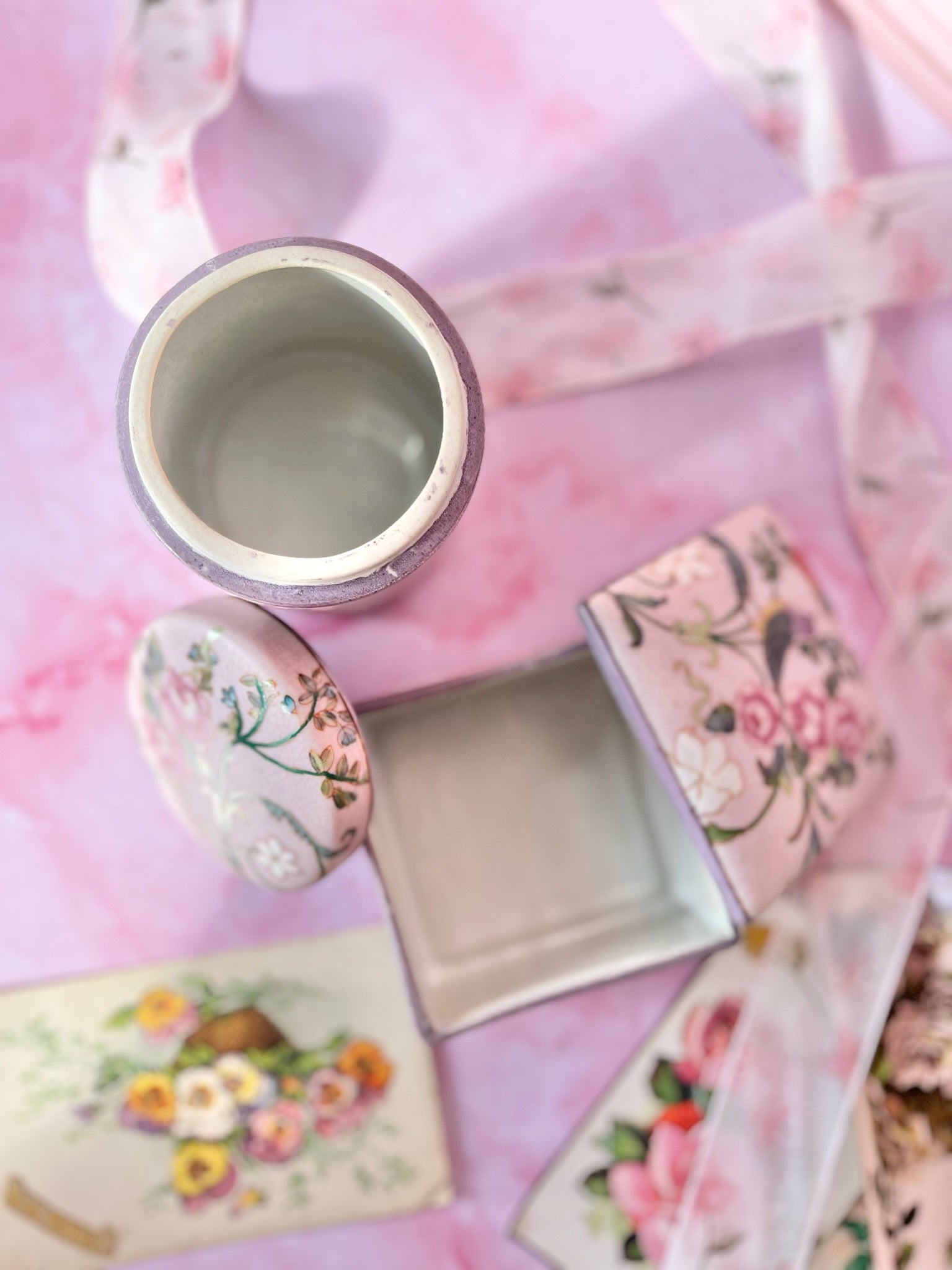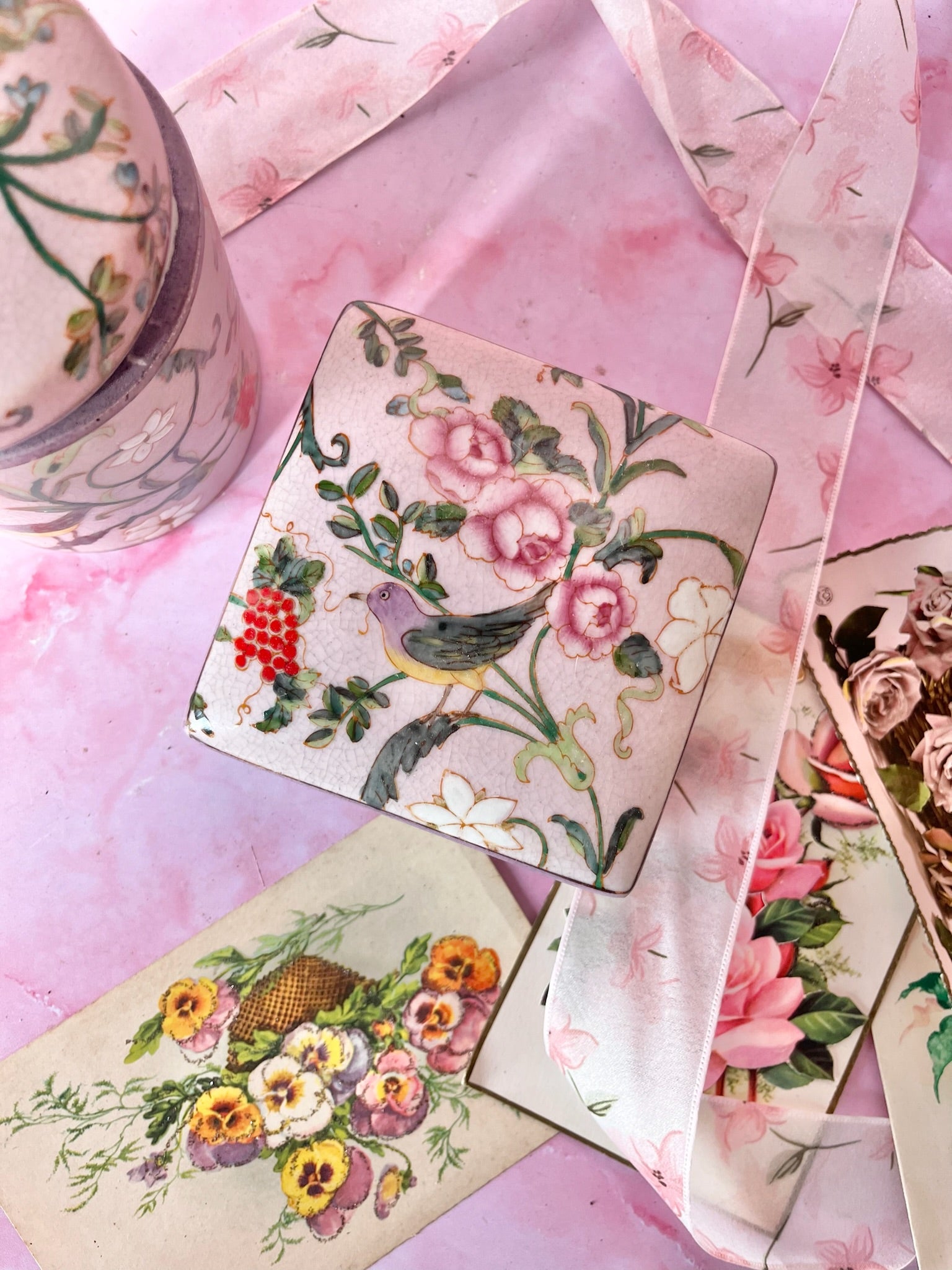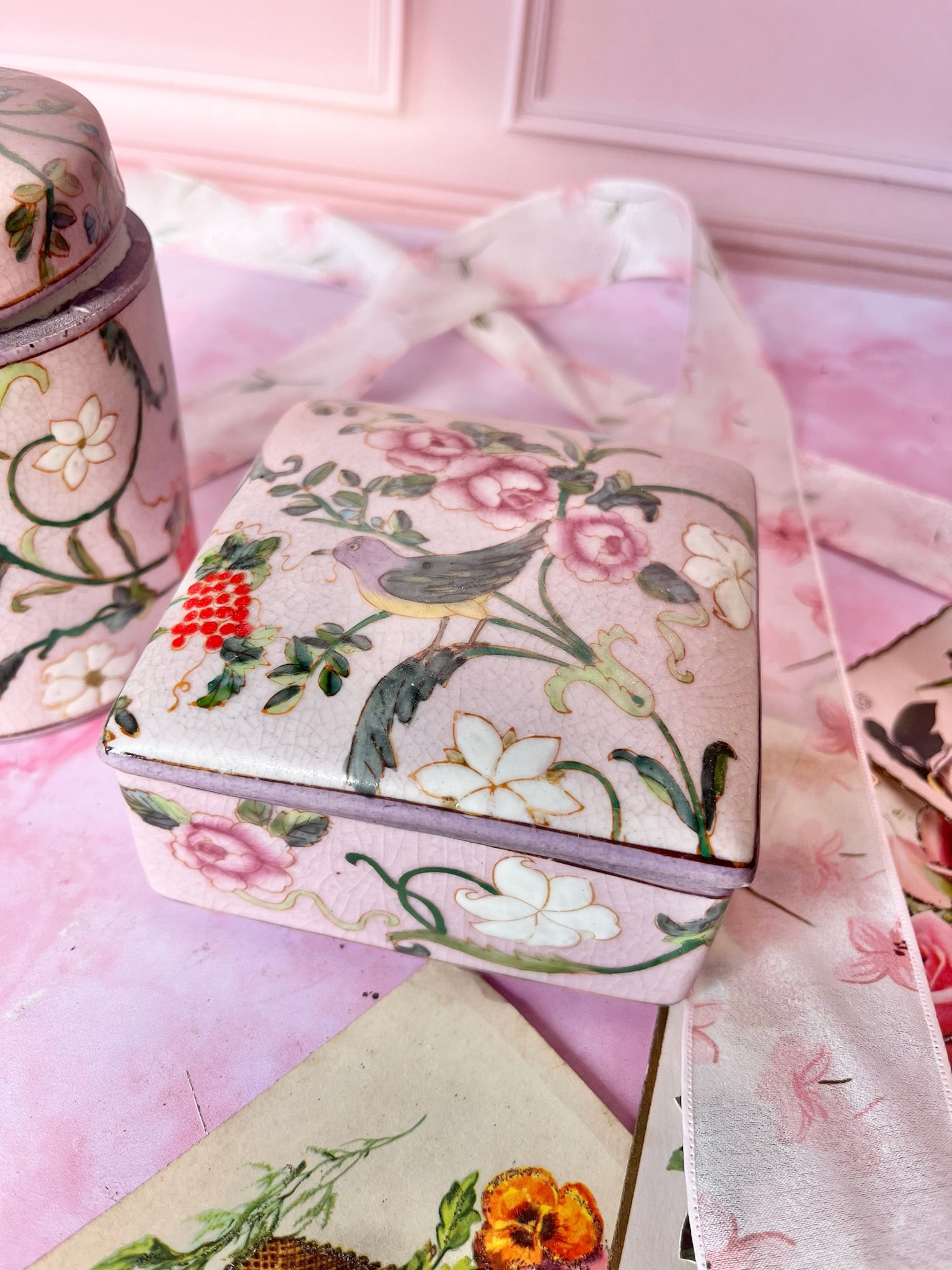 ✨ Duo de boîtes en porcelaine – Décor oiseaux & fleurs – Fond lila ✨