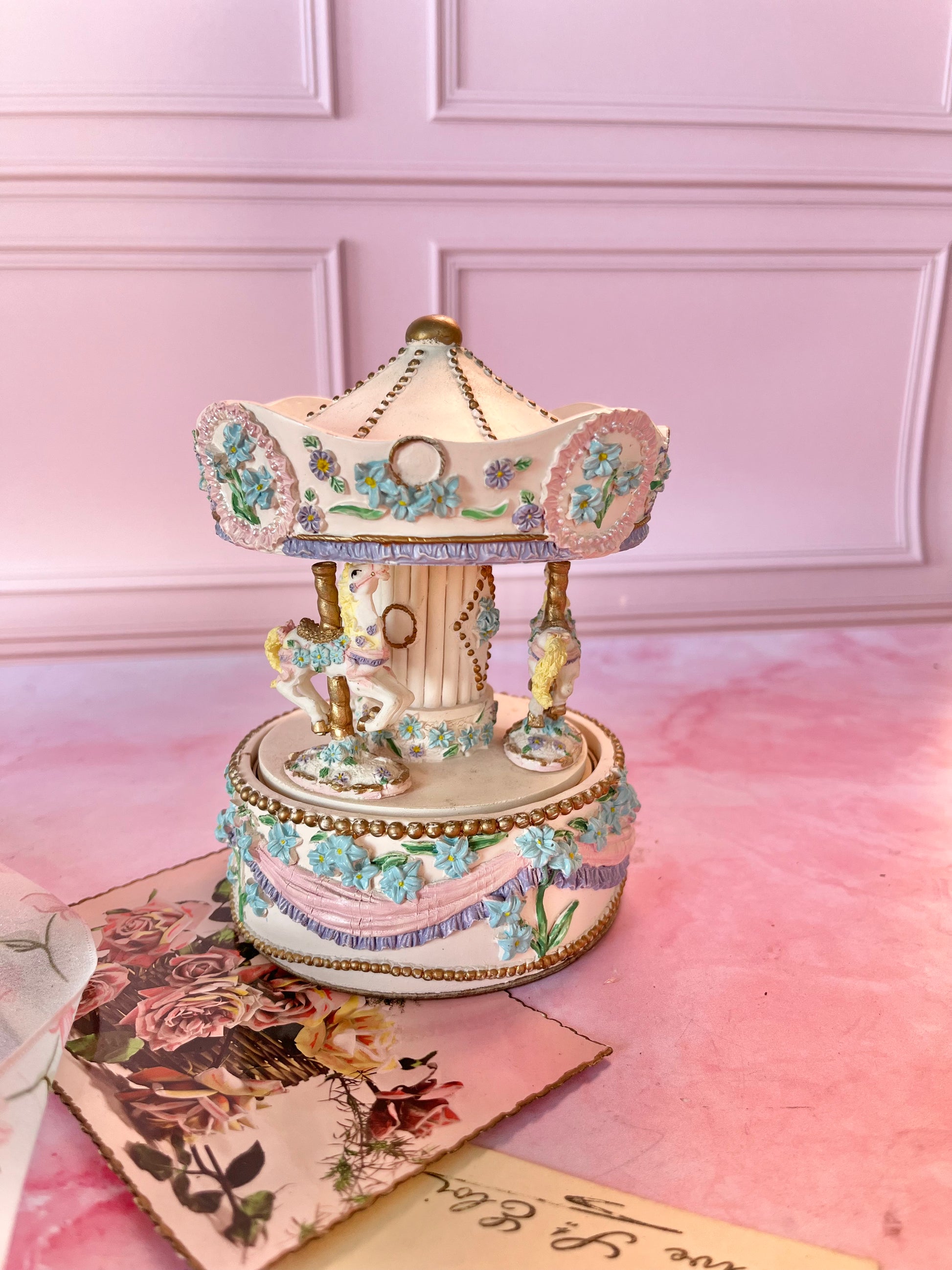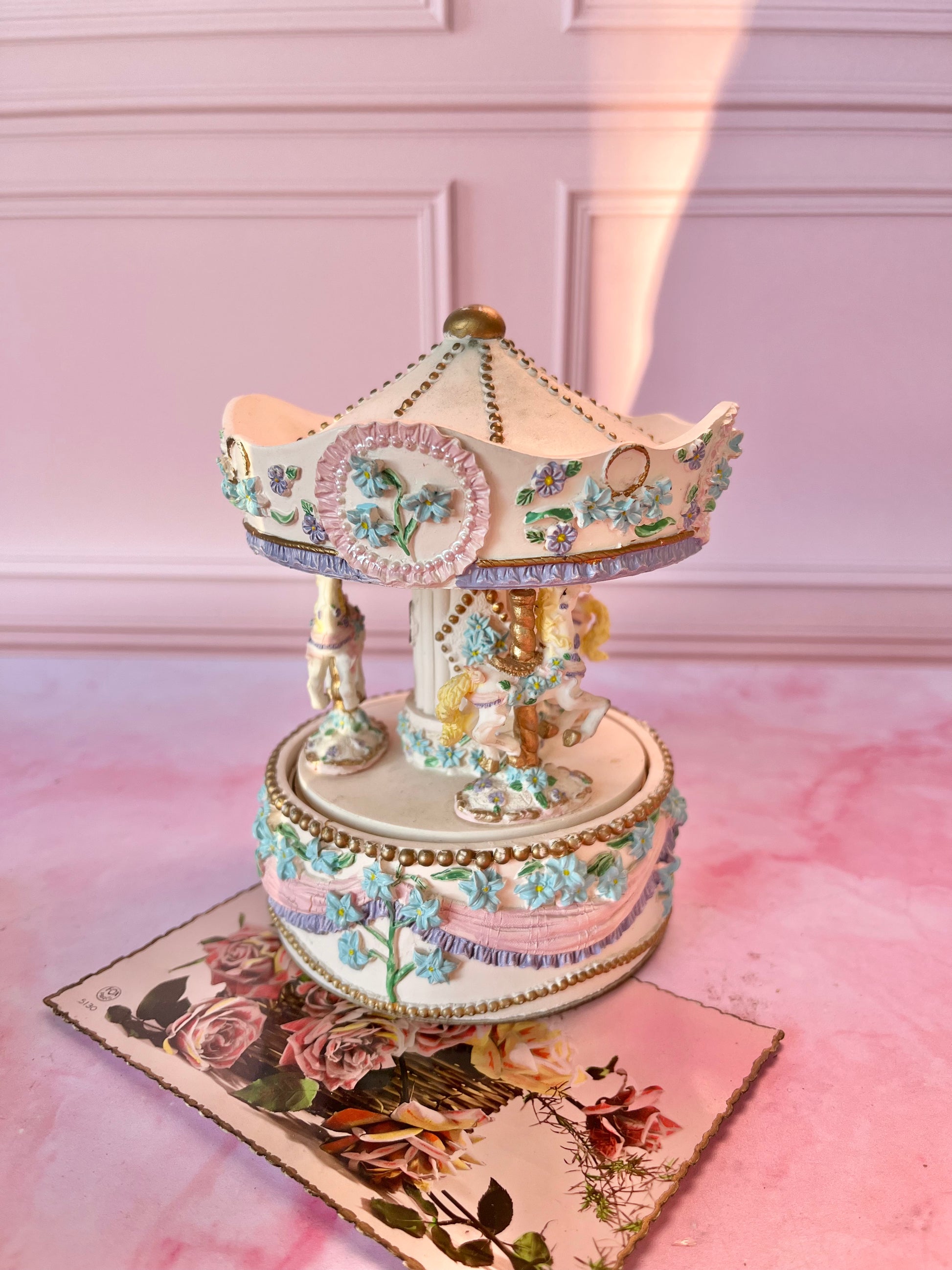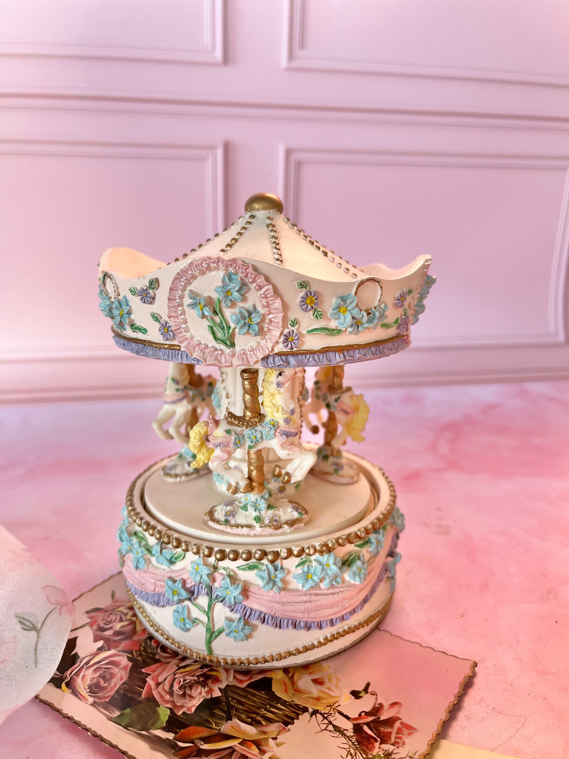 Laissez-vous séduire par ce superbe carrousel chevaux musical, au look délicieusement vintage et aux couleurs douces, épurées et romantiques. Une pièce décorative pleine de magie, qui apporte instantanément une touche poétique à une chambre, un salon ou une coiffeuse.