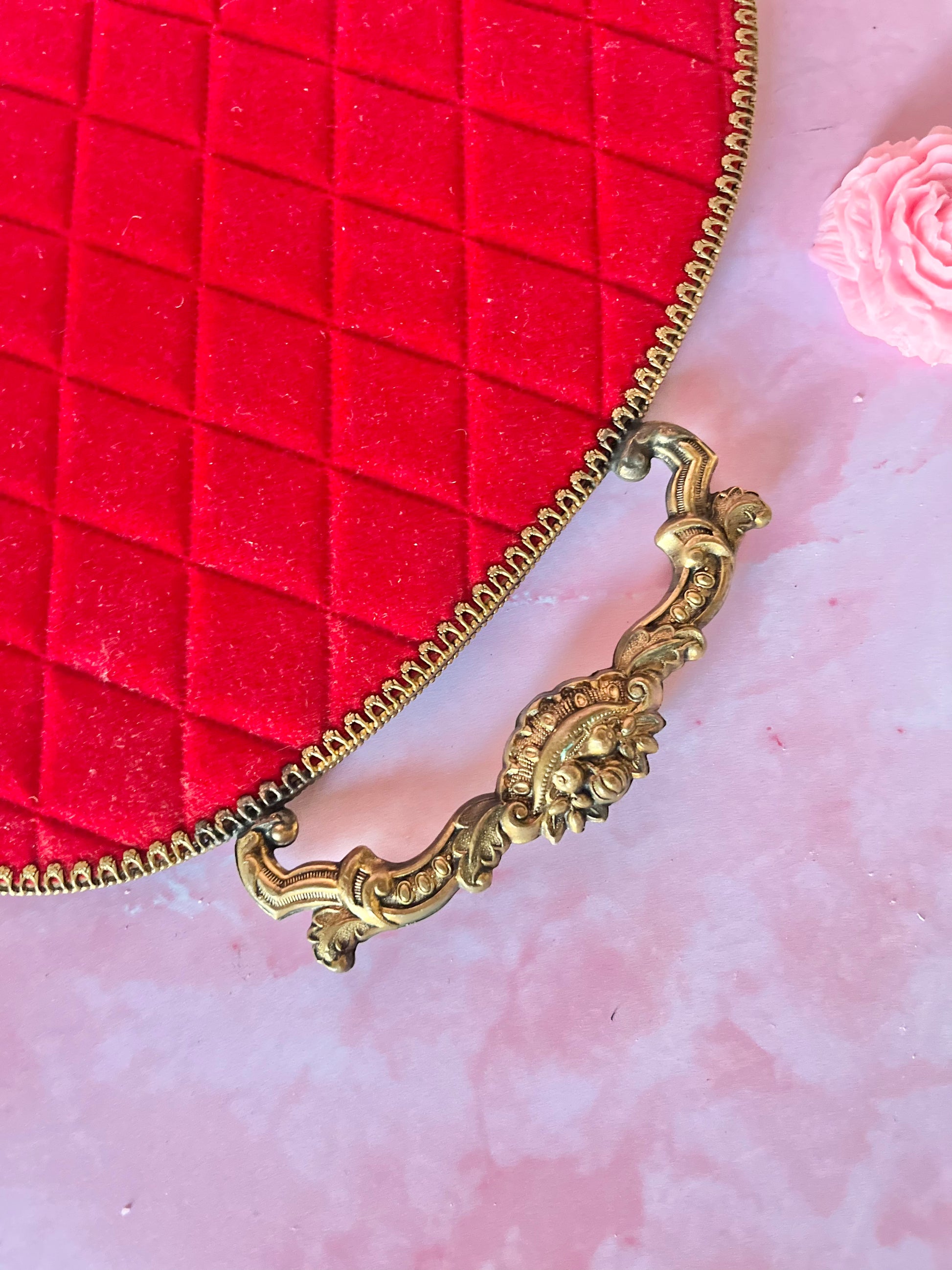 ✨ Miroir à main damier – Laiton & velours rouge ✨