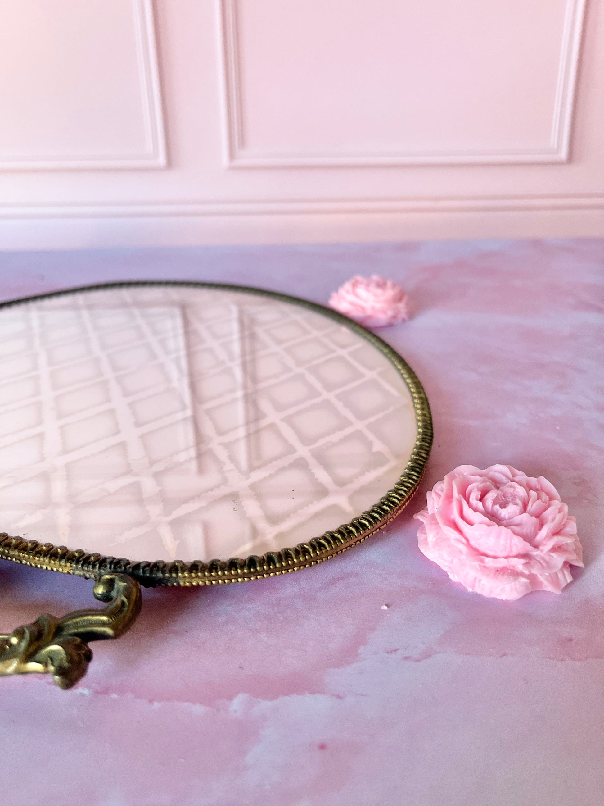 Magnifique miroir à main au motif damier, une pièce élégante et rare mêlant laiton et velours damier à l’arrière. Son design rétro et raffiné en fait un objet aussi décoratif qu’utile : parfait sur une coiffeuse, dans une chambre ou même en élément déco posé sur un meuble.