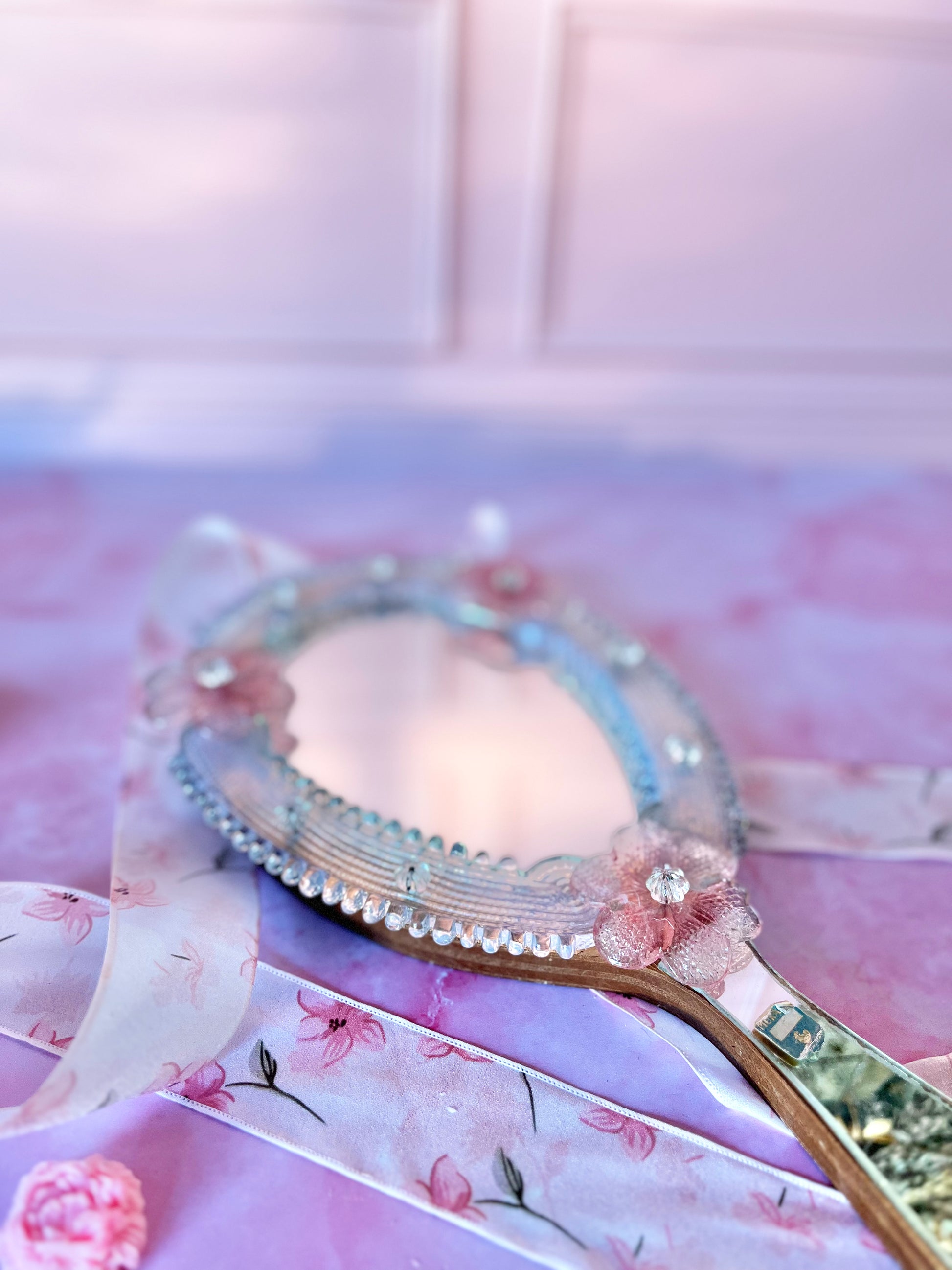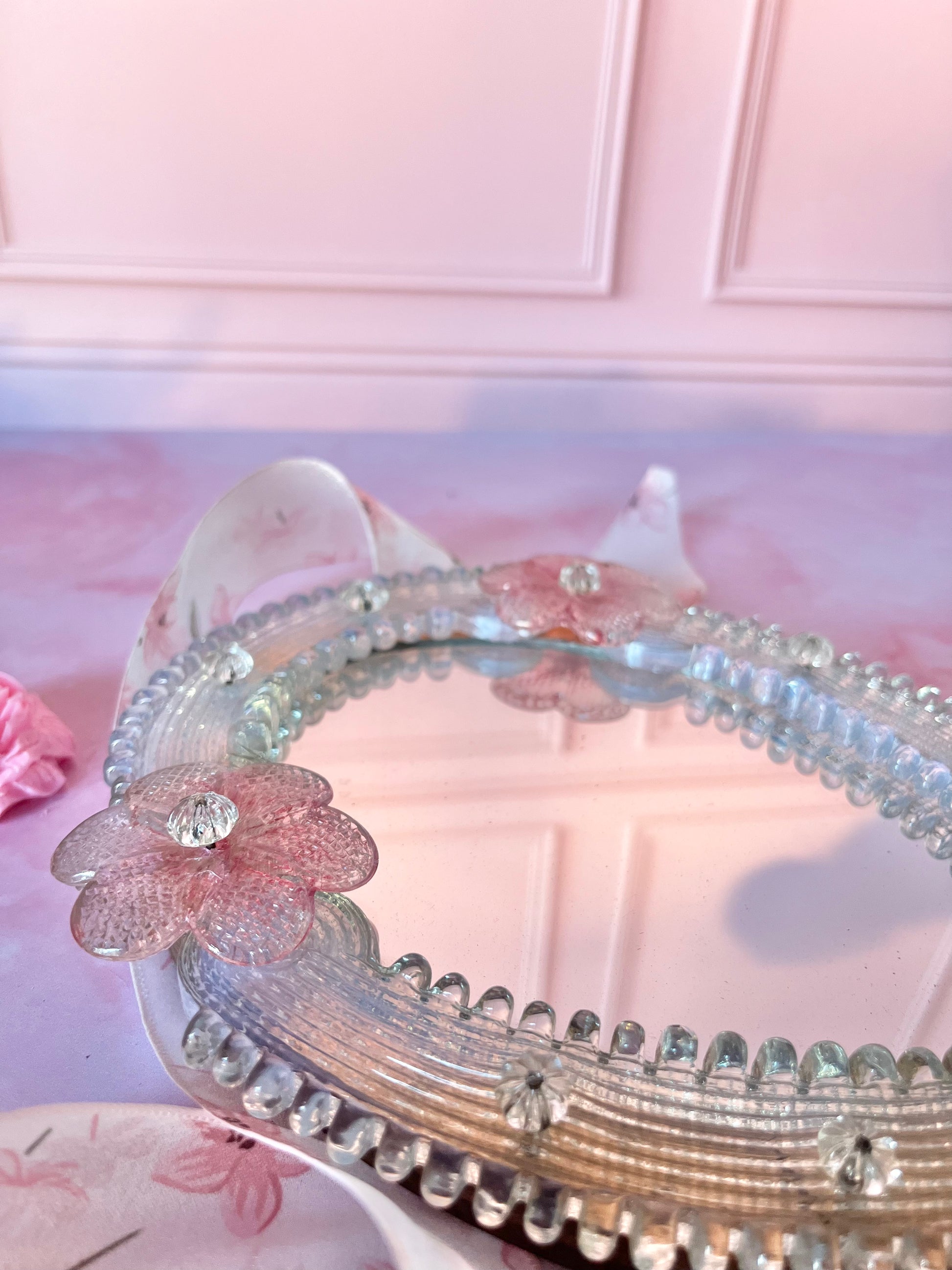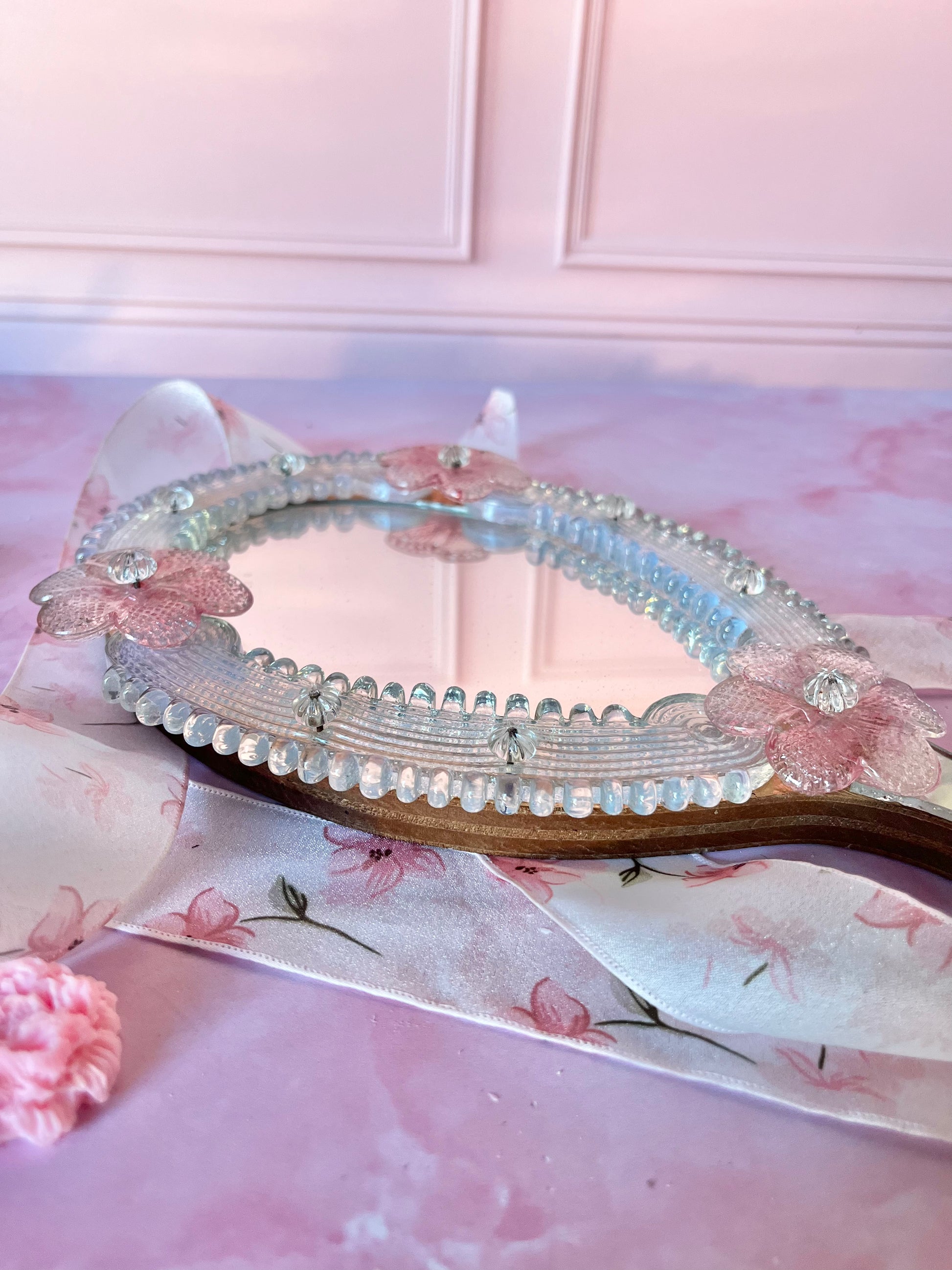 Laissez-vous séduire par ce splendide miroir à main en verre de Murano, orné d’un délicat décor floral. Une pièce rare, absolument comme neuve, avec un effet miroir présent jusque sur le manche — un détail magnifique qui révèle toute la finesse du travail artisanal.