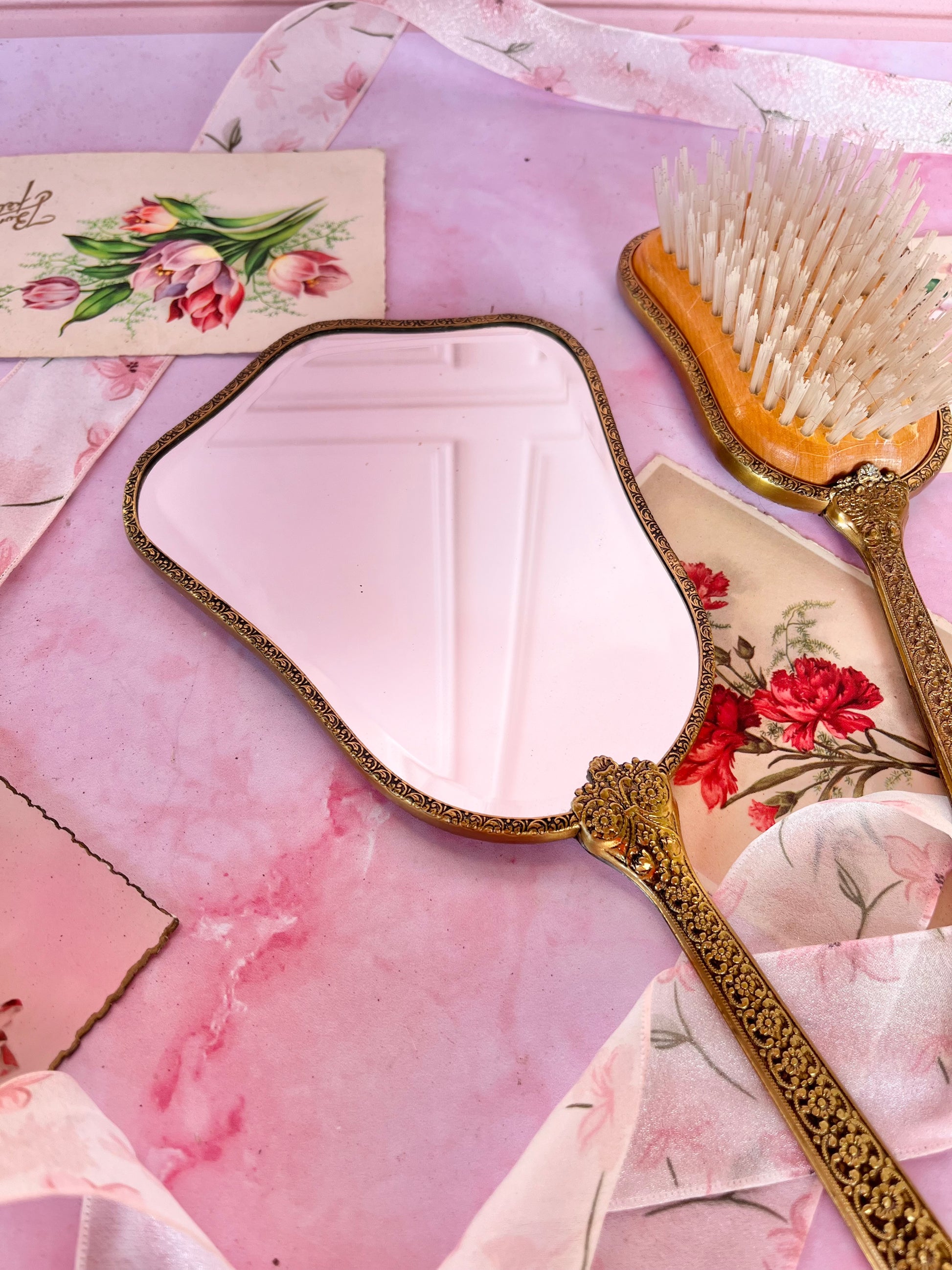 ✨ Set miroir & brosse anciens en laiton doré ✨