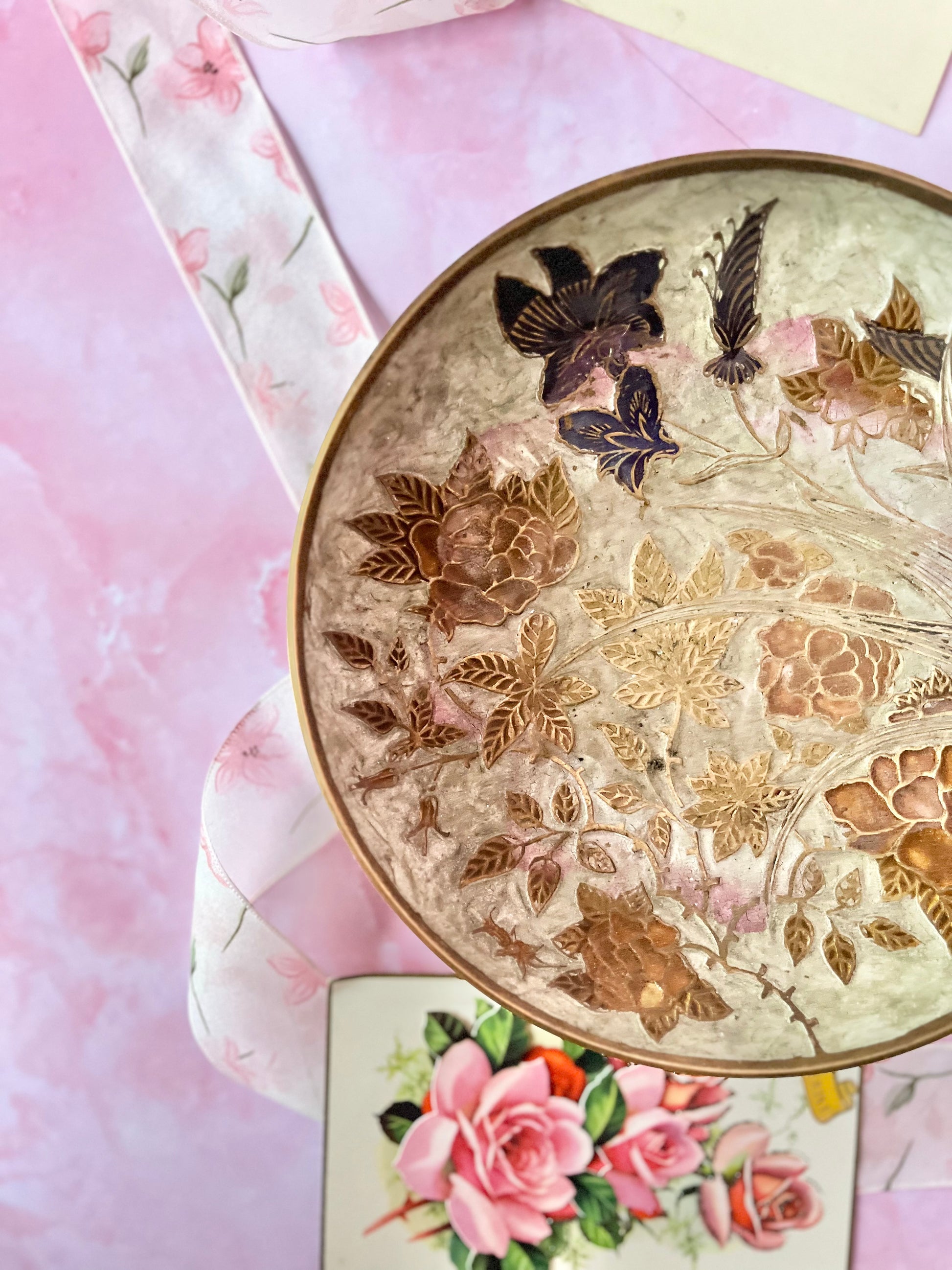 Laissez-vous séduire par cette superbe coupelle en laiton vintage, sublimée par une peinture émaillée au décor floral et naturel. Une pièce pleine de charme, à la fois élégante et décorative, qui apportera une touche raffinée et chaleureuse à votre intérieur.