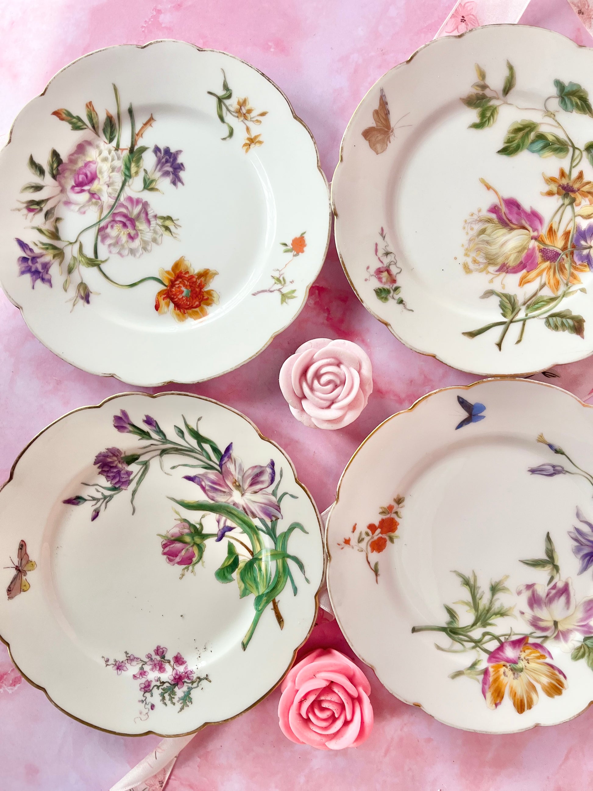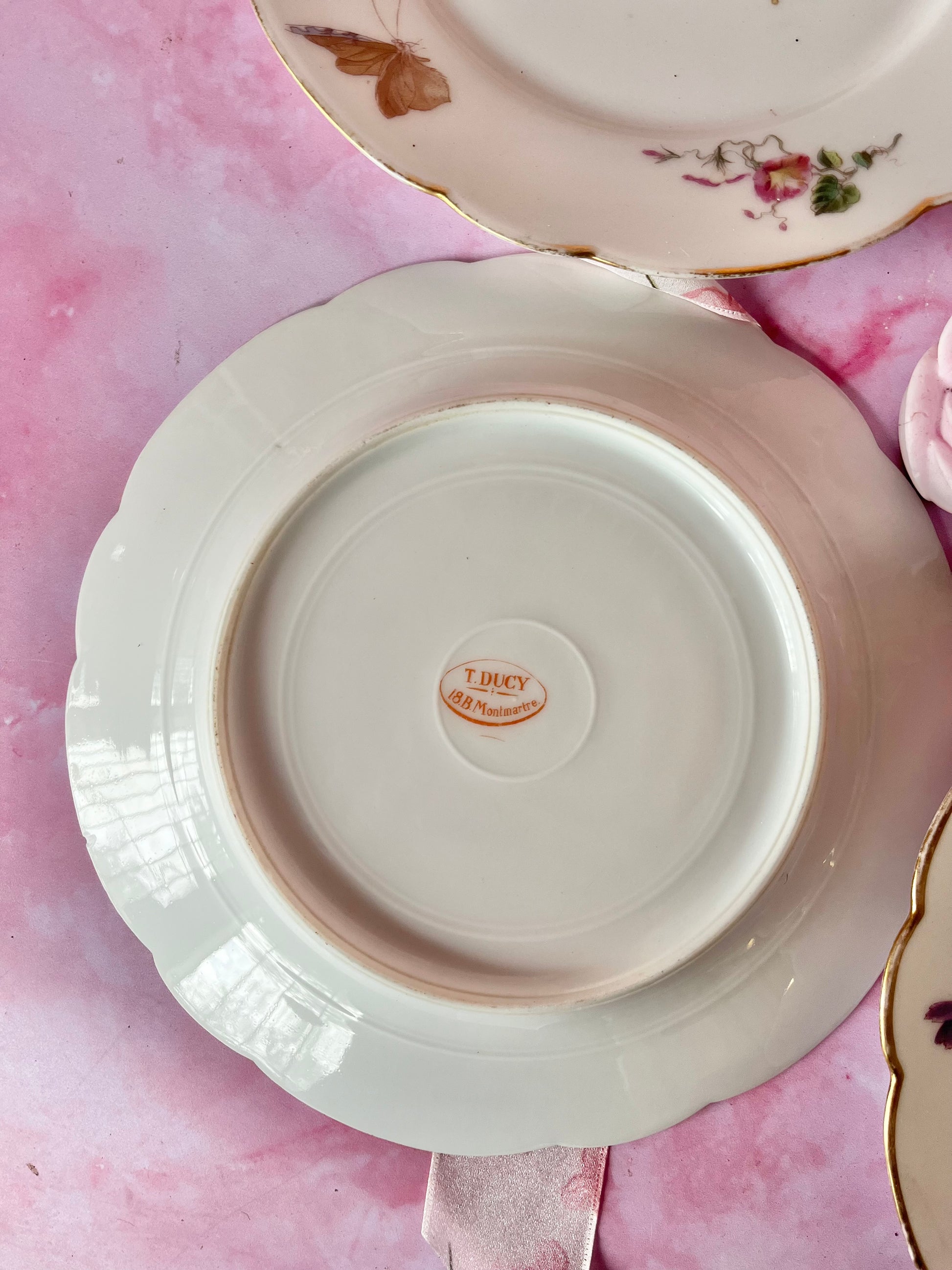 Véritable coup de cœur pour ce lot de 4 assiettes à dessert anciennes en porcelaine fine, datant de la fin du XIXᵉ siècle, modèle Montmartre. Des pièces d’une grande finesse, au décor floral délicat et raffiné, témoins d’un savoir-faire ancien et précieux.