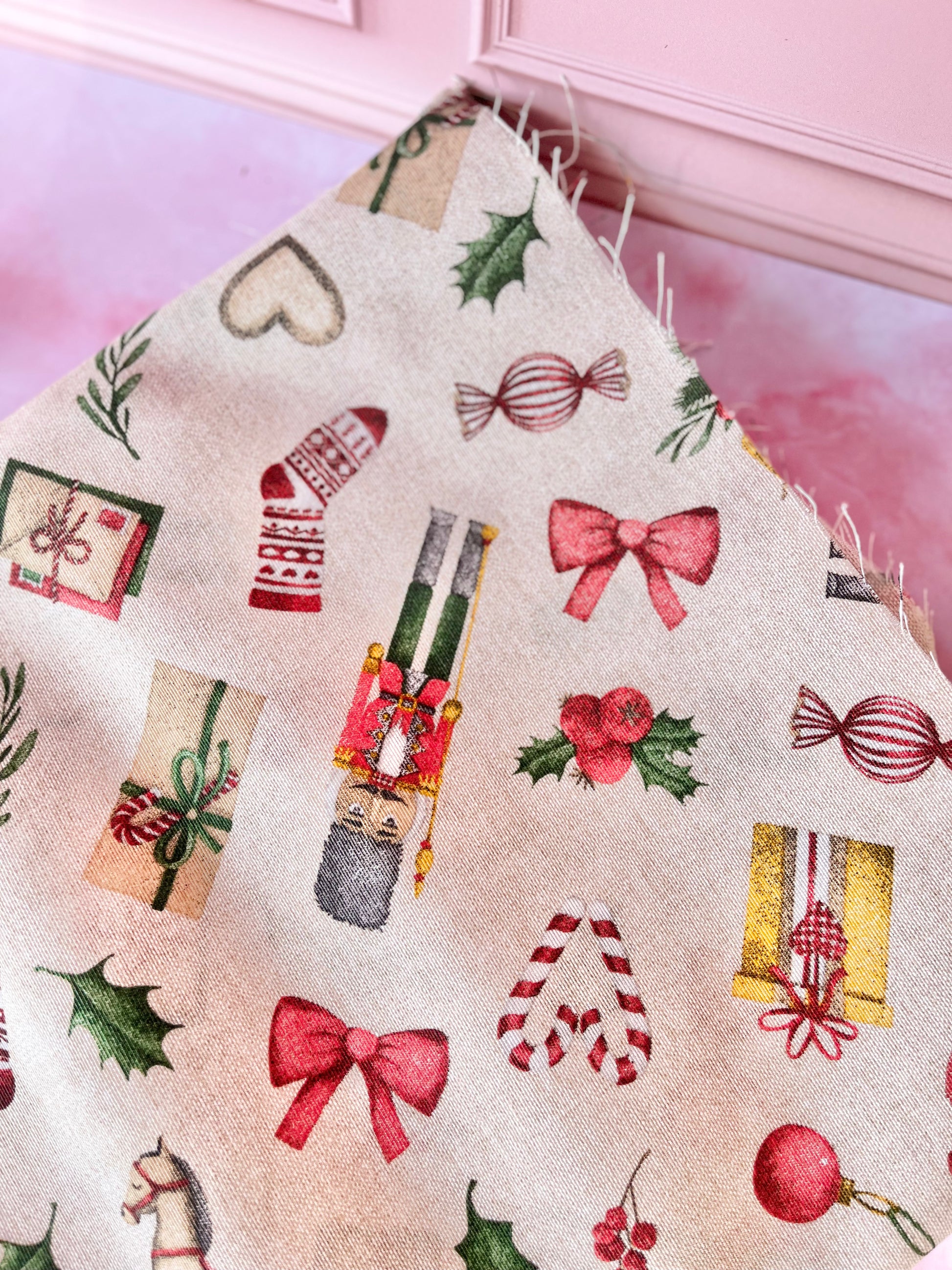Craquez pour ce superbe tissu de Noël aux motifs enchanteurs : Casse-Noisette, étoiles, cœurs, chevaux… Un univers magique qui fera briller votre intérieur pendant les fêtes !